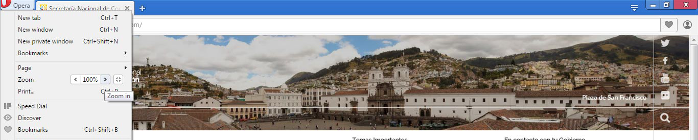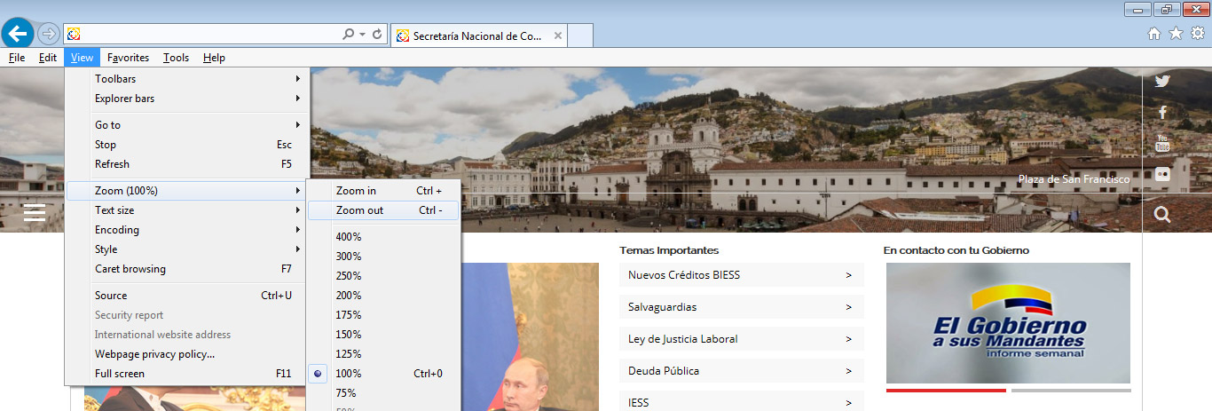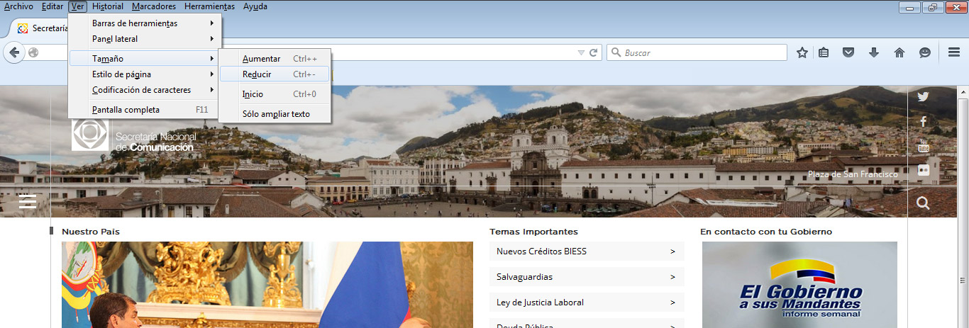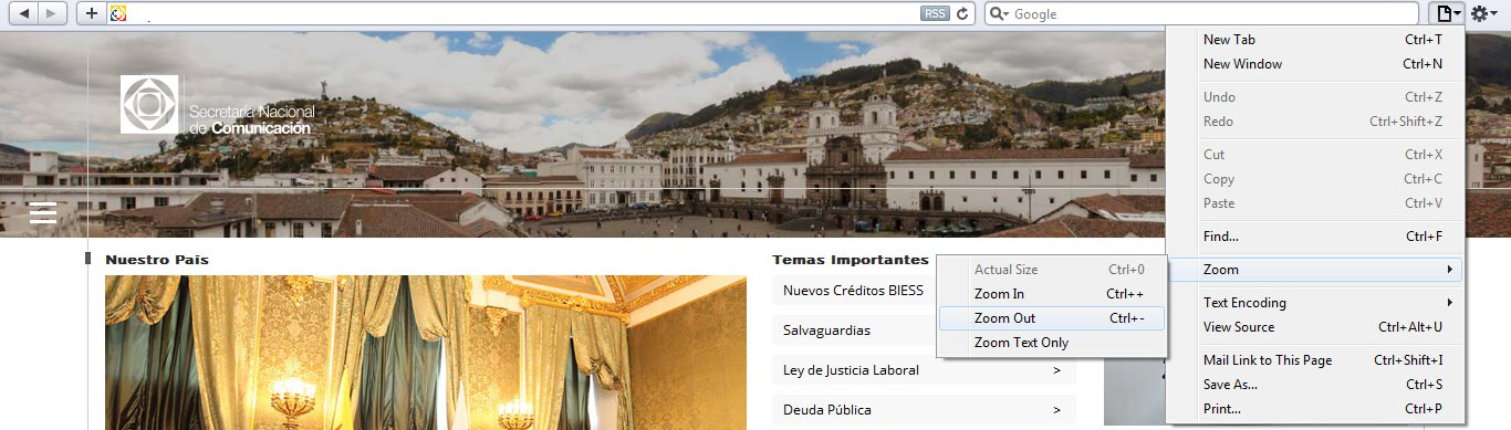 Para usarlo, se va a la parte superior derecha de la ventana, el icono (Menú de la página actual) y se hace clic en el botón Escala (Zoom), allí están las opciones de acercar, alejar y solo hacer zoom al texto.