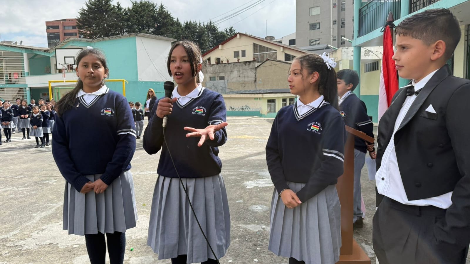 Entre carteles y fragmentos de las obras del poeta ecuatoriano Efraín Jara Idrovo, estudiantes de la Unidad Educativa República de Bolivia destacaron su legado literario durante el momento cívico, promoviendo el reconocimiento y valoración de su obra literaria entre la comunidad educativa.