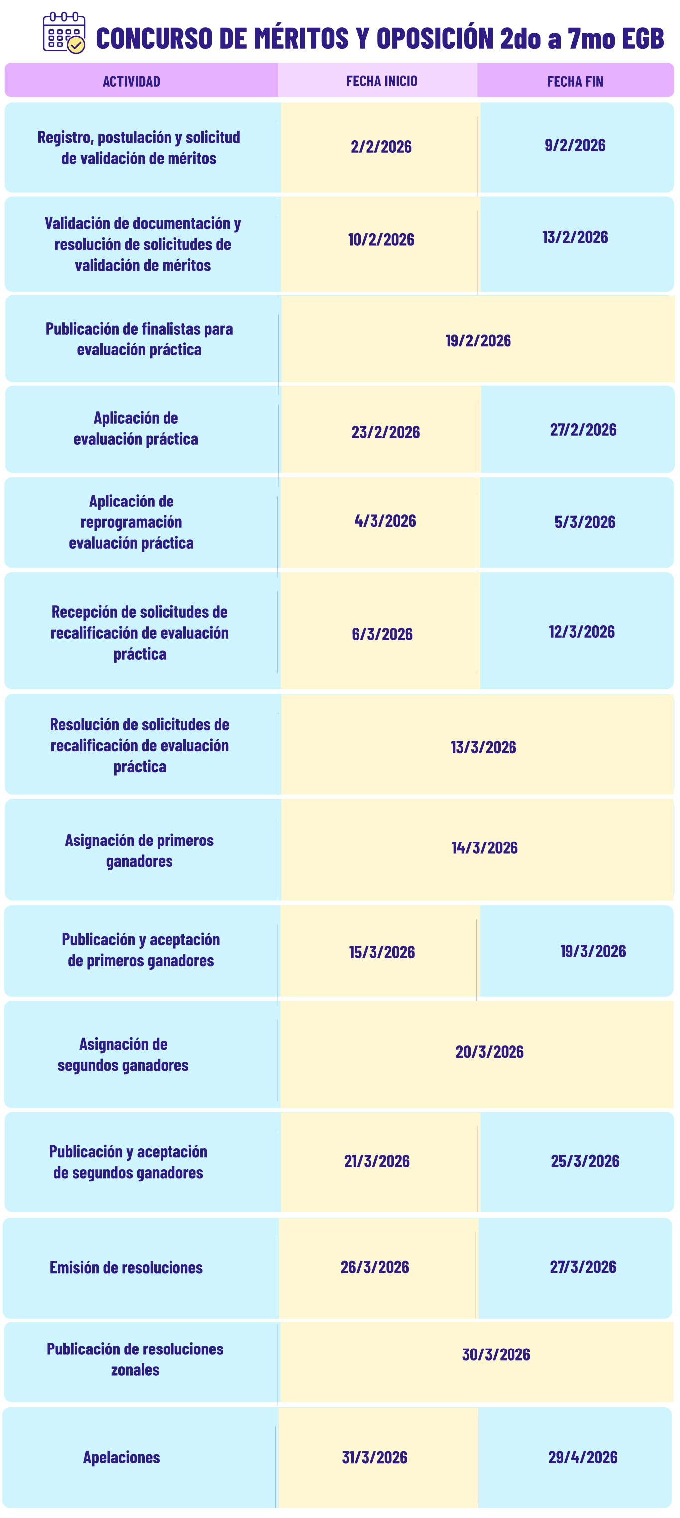 Las apelaciones podrán presentarse una vez finalizado el concurso de méritos y oposición, tras la publicación de la resolución de ganadores zonales. Los participantes no favorecidos podrán apelar los resultados dentro del plazo de treinta días, contados a partir del día siguiente a la publicación de los resultados en la página web de la Autoridad Educativa Nacional, únicamente respecto a una de las vacantes seleccionadas. Esta información será notificada a través de la Junta Distrital de Resolución de Conflictos y de la plataforma informática del Ministerio de Educación, Deporte y Cultura.