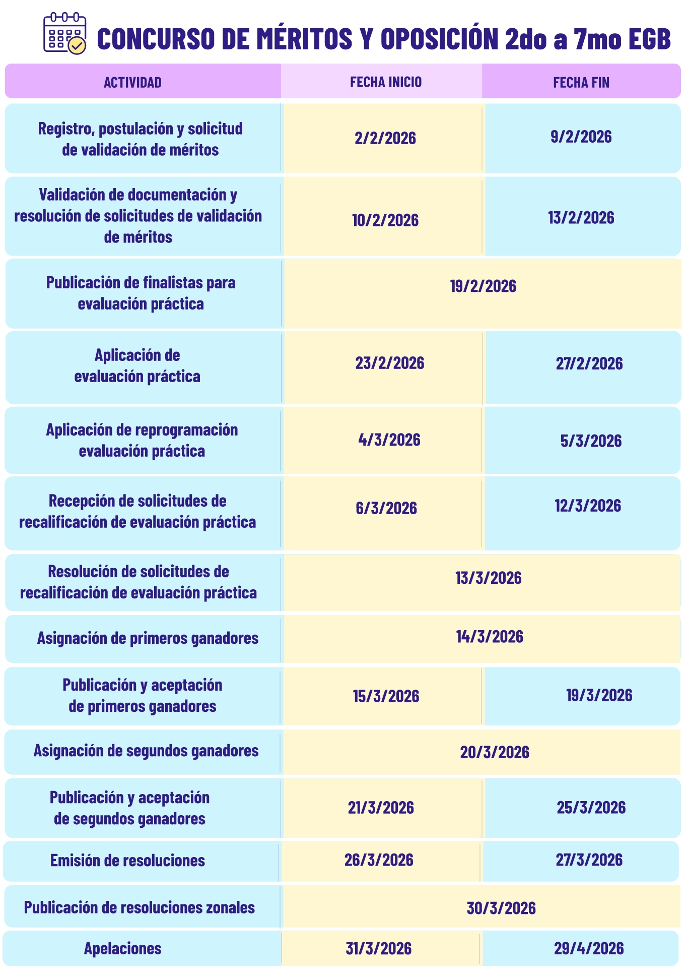 Las apelaciones podrán presentarse una vez finalizado el concurso de méritos y oposición, tras la publicación de la resolución de ganadores zonales. Los participantes no favorecidos podrán apelar los resultados dentro del plazo de treinta días, contados a partir del día siguiente a la publicación de los resultados en la página web de la Autoridad Educativa Nacional, únicamente respecto a una de las vacantes seleccionadas. Esta información será notificada a través de la Junta Distrital de Resolución de Conflictos y de la plataforma informática del Ministerio de Educación, Deporte y Cultura.
