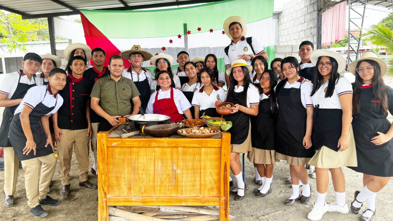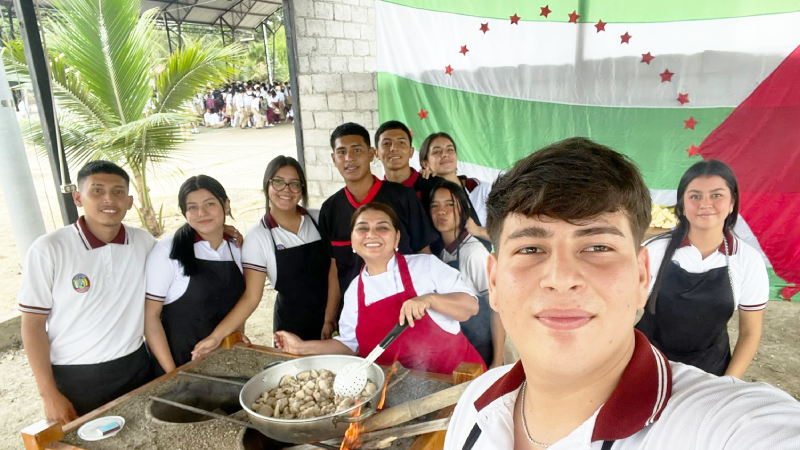 Pero su espíritu no conoce fronteras. En 2022, junto a colegas de la Unidad Educativa Ignacio Hernández de la isla San Cristóbal, creó el Intercambio Pedagógico Cultural Gastronómico Manabí-Galápagos, un puente de sabores, costumbres y aprendizajes. Ya son cinco ediciones de este encuentro que une a jóvenes de dos mundos distintos bajo una misma pasión: aprender y compartir.