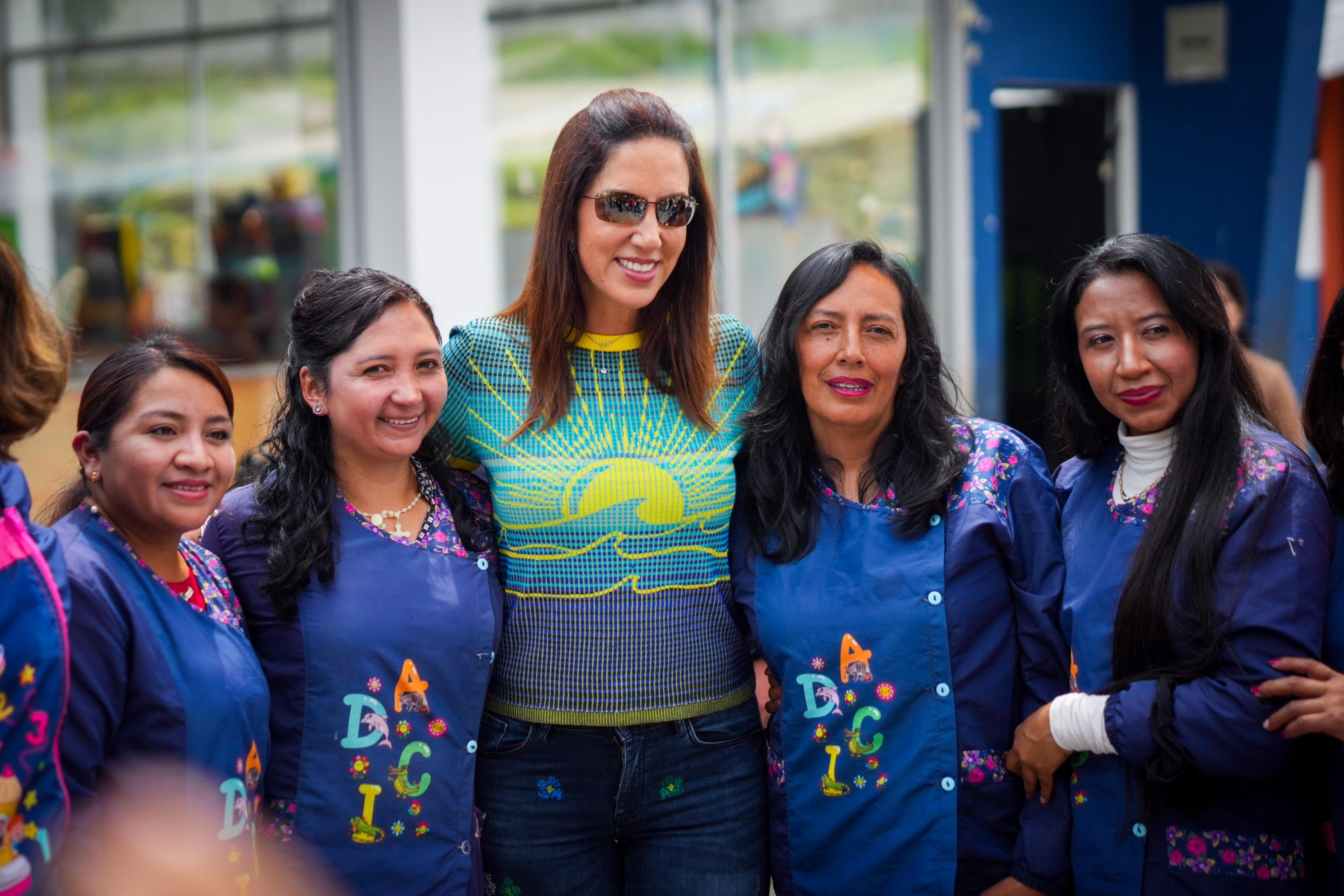 Durante su recorrido, la ministra interactuó con estudiantes de Bachillerato Técnico en Industria de la Confección en la Unidad Educativa Tumbaco.
