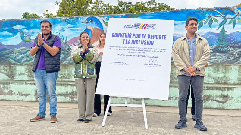 Además, con la presencia de la vicepresidenta de la República, María José Pinto, como testigo de honor, el ministro Desarrollo Humano, Harold Burbano, y el viceministro de Deporte, José David Jiménez, suscribieron el convenio interinstitucional “Por el Deporte y la Inclusión”, que busca promover el bienestar integral de los grupos de atención prioritaria a través de la actividad física y recreativa.