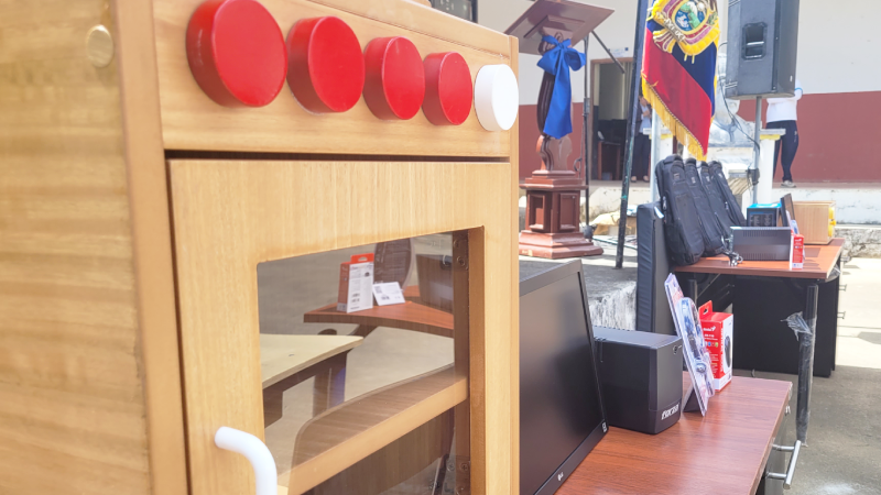 Adicionalmente, se complementó el apoyo a la comunidad educativa con escritorios, pupitres, sillas, colchonetas y otros elementos de mobiliario escolar que benefician tanto a docentes como a más de 2.200 estudiantes de 13 instituciones educativas, con una inversión de USD 15.000 dólares.