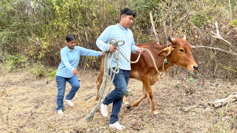 En una extensión de 10 hectáreas, los estudiantes cultivan una variedad de vegetales como tomates, pimientos, yuca, cacao y maíz, además de plantas frutales como mango, naranjas, limones e incluso ciruelas. También cuentan con áreas destinadas a la crianza de animales como pollos, yeguas, vacas, cerdos, cabras y conejos, todos bajo un manejo responsable y supervisión veterinaria.