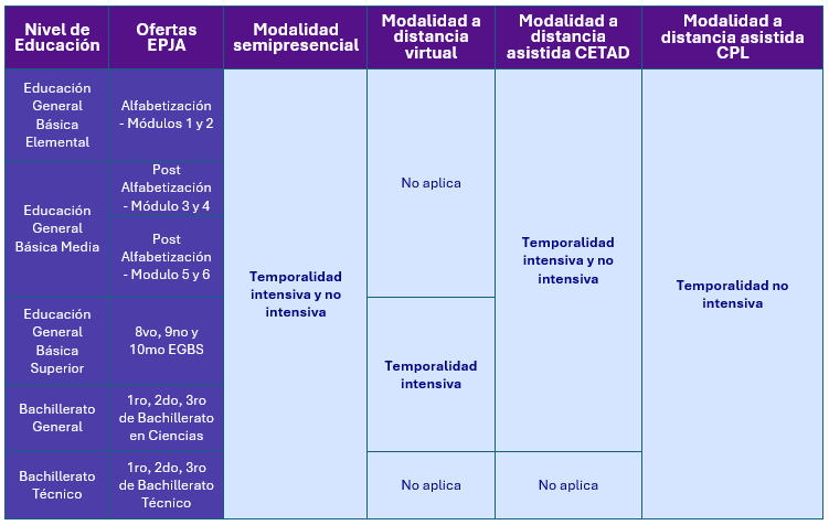 Las ofertas educativas para jóvenes, adultas y adultas mayores se implementan en las modalidades semipresencial y a distancia (virtual y asistida), con dos temporalidades: