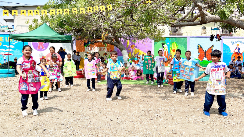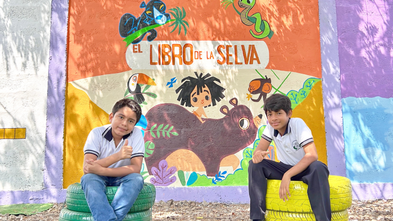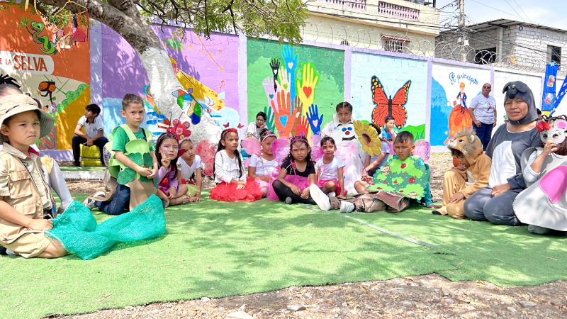 A un costado del patio de la Escuela de Educación Básica Fiscal Francisco Pérez Castro, ubicada en Durán, entre árboles frondosos y bajo la sombra fresca de sus ramas se encuentra un rincón que invita a soñar. El suelo está decorado con llantas recicladas que ahora sirven como coloridos asientos. Trozos de troncos funcionan como bancas y las paredes cercanas están cubiertas de murales vibrantes, pintados por estudiantes y padres de familia que celebran el poder de la lectura. Este espacio encantador se llama Bosque Lector: “Cultivando lectores, creando futuros” y fue inaugurado recientemente en el marco de la política “Juntos Leemos” que impulsa el Ministerio de Educación.