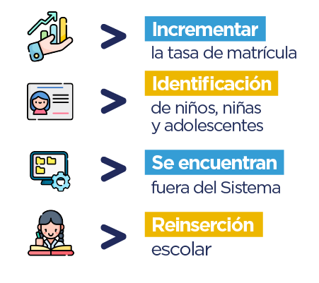Se refiere al acceso a la educación de niños, niñas, adolescentes, jóvenes y adultos que se encuentran fuera del Sistema Educativo Nacional. Una vez que los actores educativos identificaron y registraron los datos de los posibles estudiantes en el aplicativo Todos al Aula Web; los equipos de gestión territorial de la estrategia deben asesorar y acompañar al padre, madre y/o representante del niño, niña o adolescente a realizar el proceso de matrícula y/o aprestamiento según el momento del año lectivo en el que se encuentren en el momento de realizar el contacto con el representante o potencial estudiante. Así mismo, en el caso de Jóvenes y Adultos, se debe asesorar sobre las ofertas y modalidades de atención, así cómo, el cronograma de inicio del ciclo educativo.